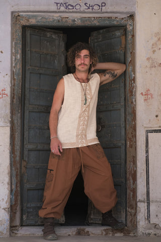 De Akash Tank Top is een gedurfd en stijlvol mouwloos herenshirt. Gemaakt van 100% ruw Bugala katoen, met een unieke blockprint die het een tribal look geeft.
