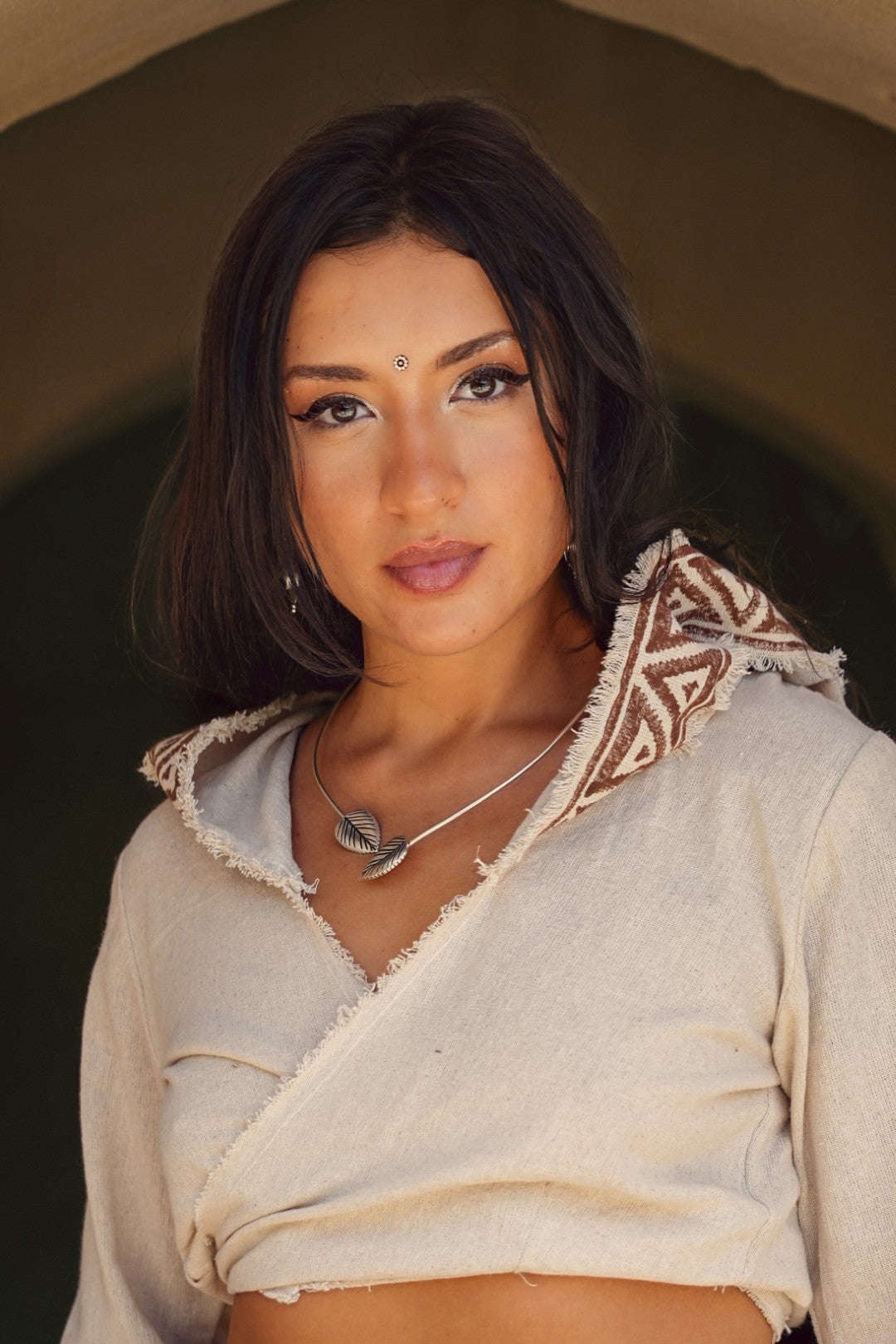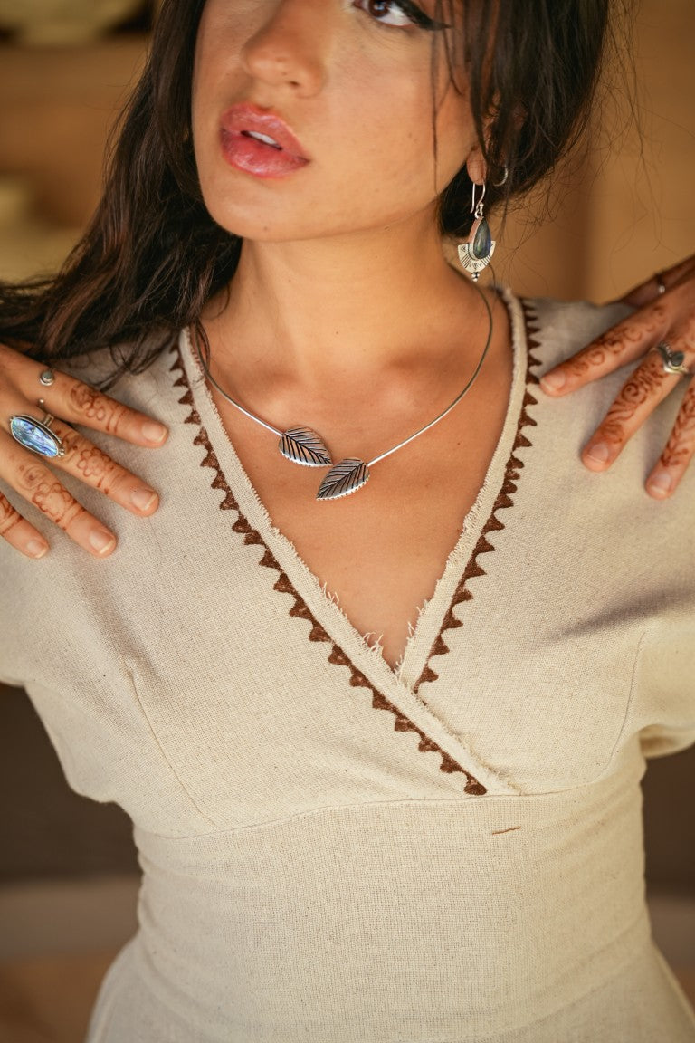 Prachtige verzilverde messing Halsketting met een groot blad aan elk uiteinde