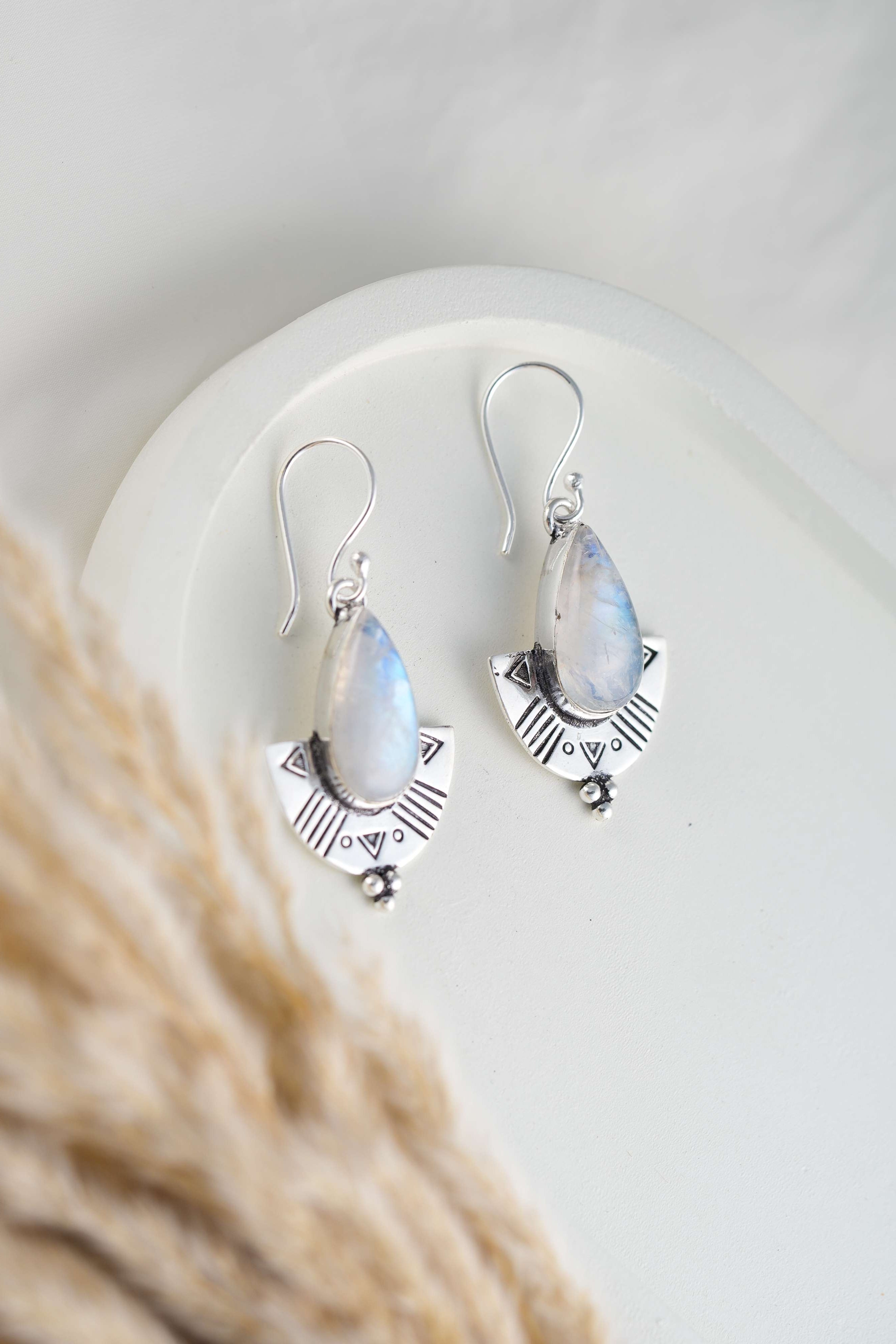 Prachtige verzilverde messing oorbellen met een Egyptisch geïnspireerd ontwerp en een grote edelsteen