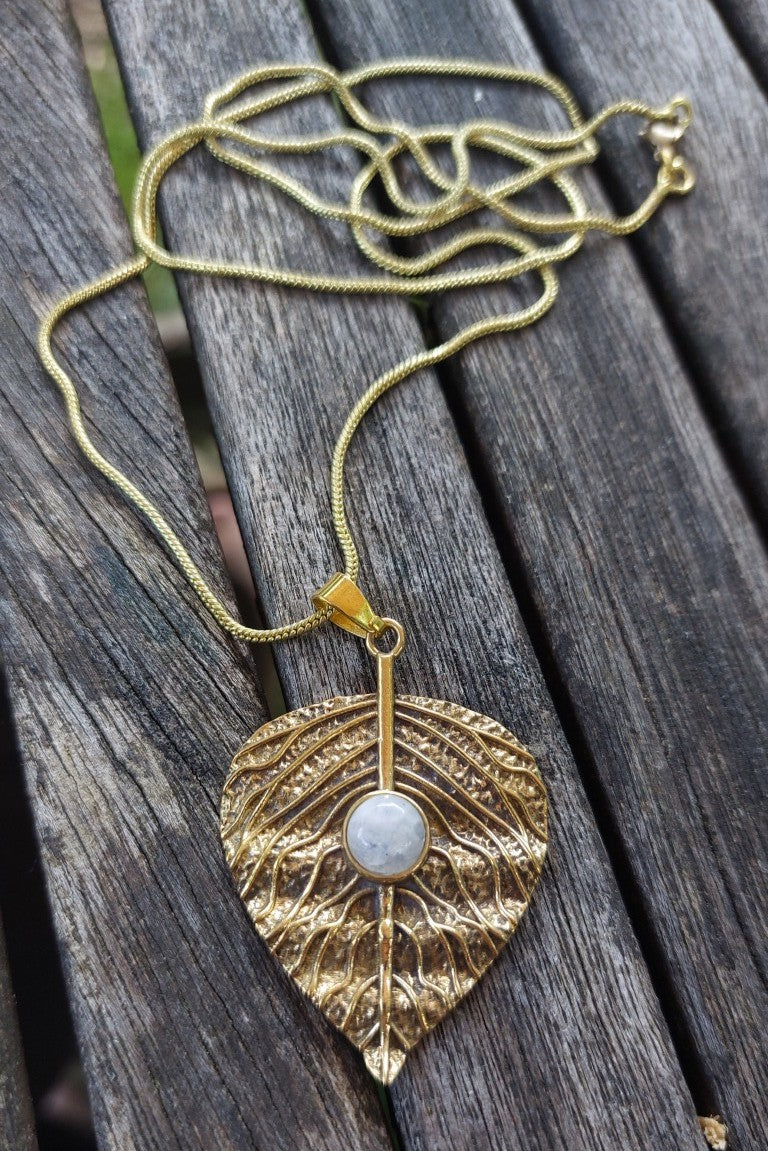 Prachtige messing hanger in de vorm van een Blaadje, met edelsteen en messing ketting.