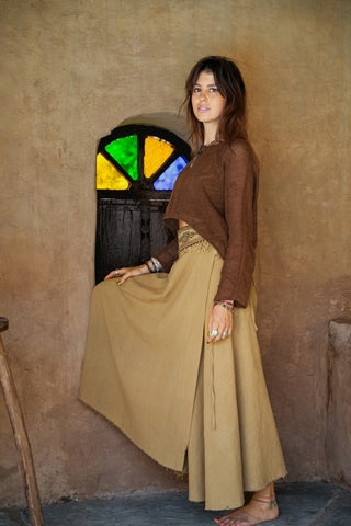 De Veda wrap skirt is een viering van moeiteloze schoonheid en ambachtelijk vakmanschap. Deze lange wikkelrok van ruw katoen valt op natuurlijke wijze om het lichaam en creëert een vloeiend silhouet met een elegante asymmetrische snit.