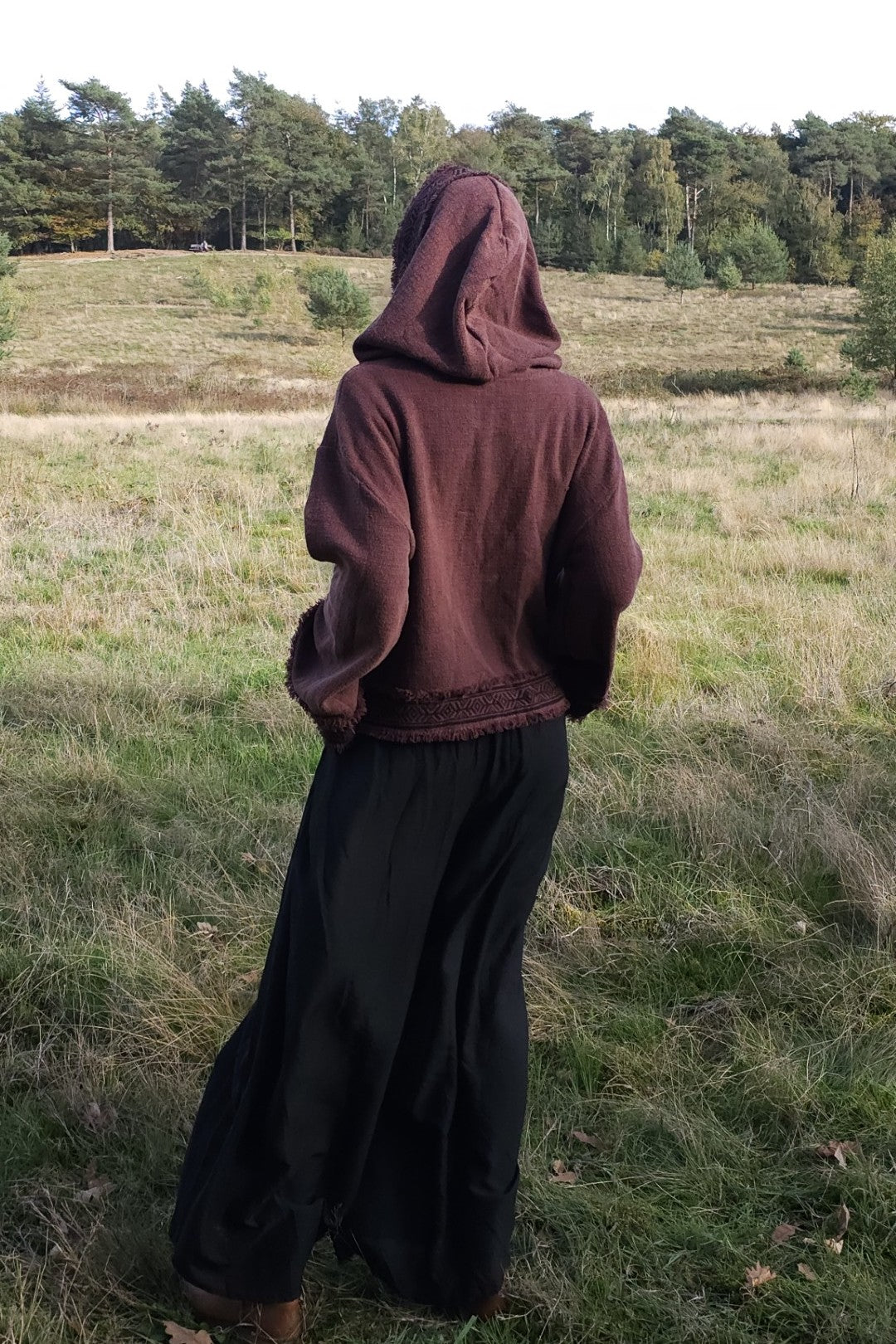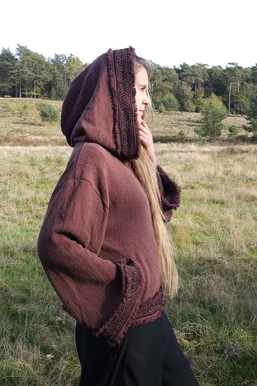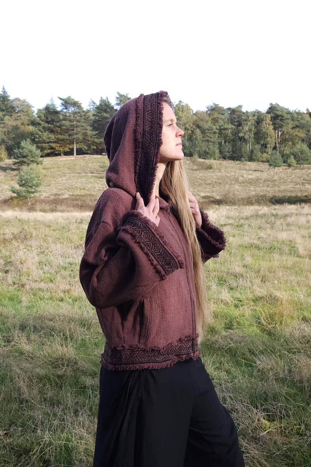 De wijde mouwen, oversized capuchon en details met onafgewerkte randen brengen een moeiteloze, vrijgevochten charme. Block print details sieren de stof als heilige markeringen, wat een diepe verbinding met kunstzinnigheid en de natuur weerspiegelt. Doordacht ontworpen met diepe zakken en een stevige ritssluiting, biedt deze jas zowel functionaliteit als een opvallende schoonheid.