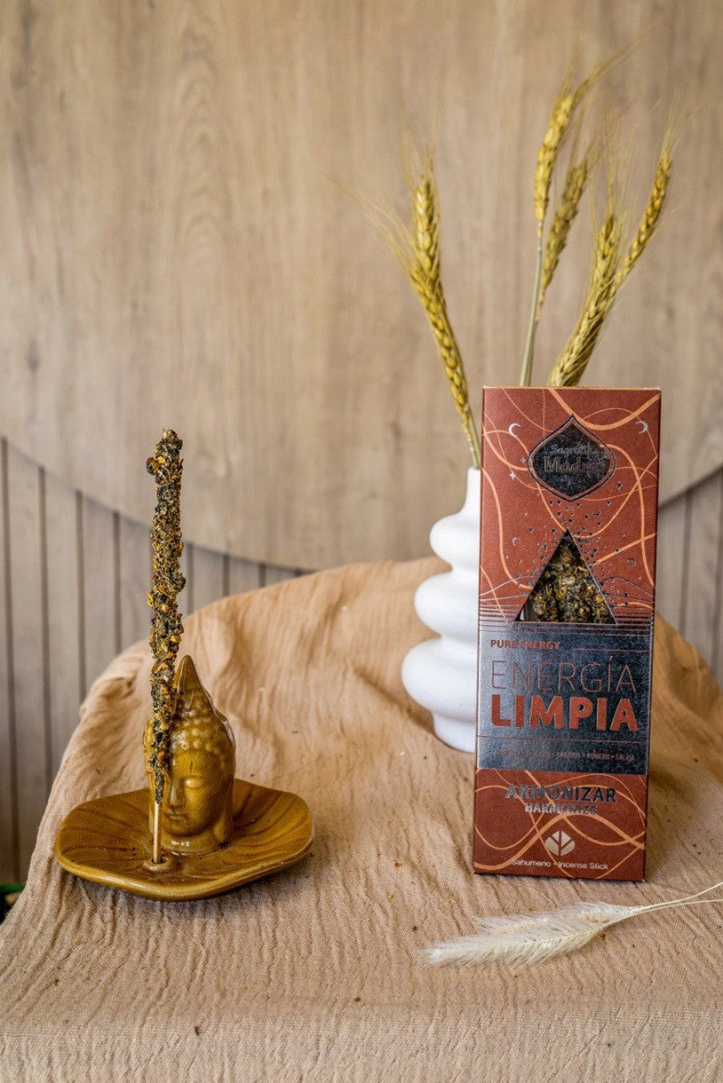Sagrada Madre Harmonise Pure Energy Incense centres and calms your space with a soothing blend of herbal and woody aromas, carefully crafted with natural ingredients to promote peace, balance, and spiritual harmony. The smells of olibanum and cedar fill your room, grounding you with their rich, woodsy scents and creating a peaceful space.