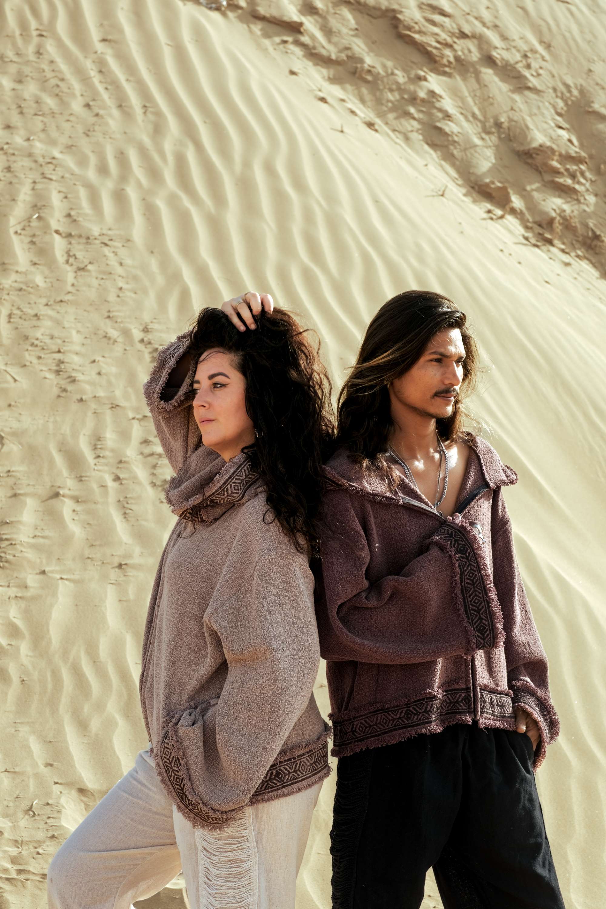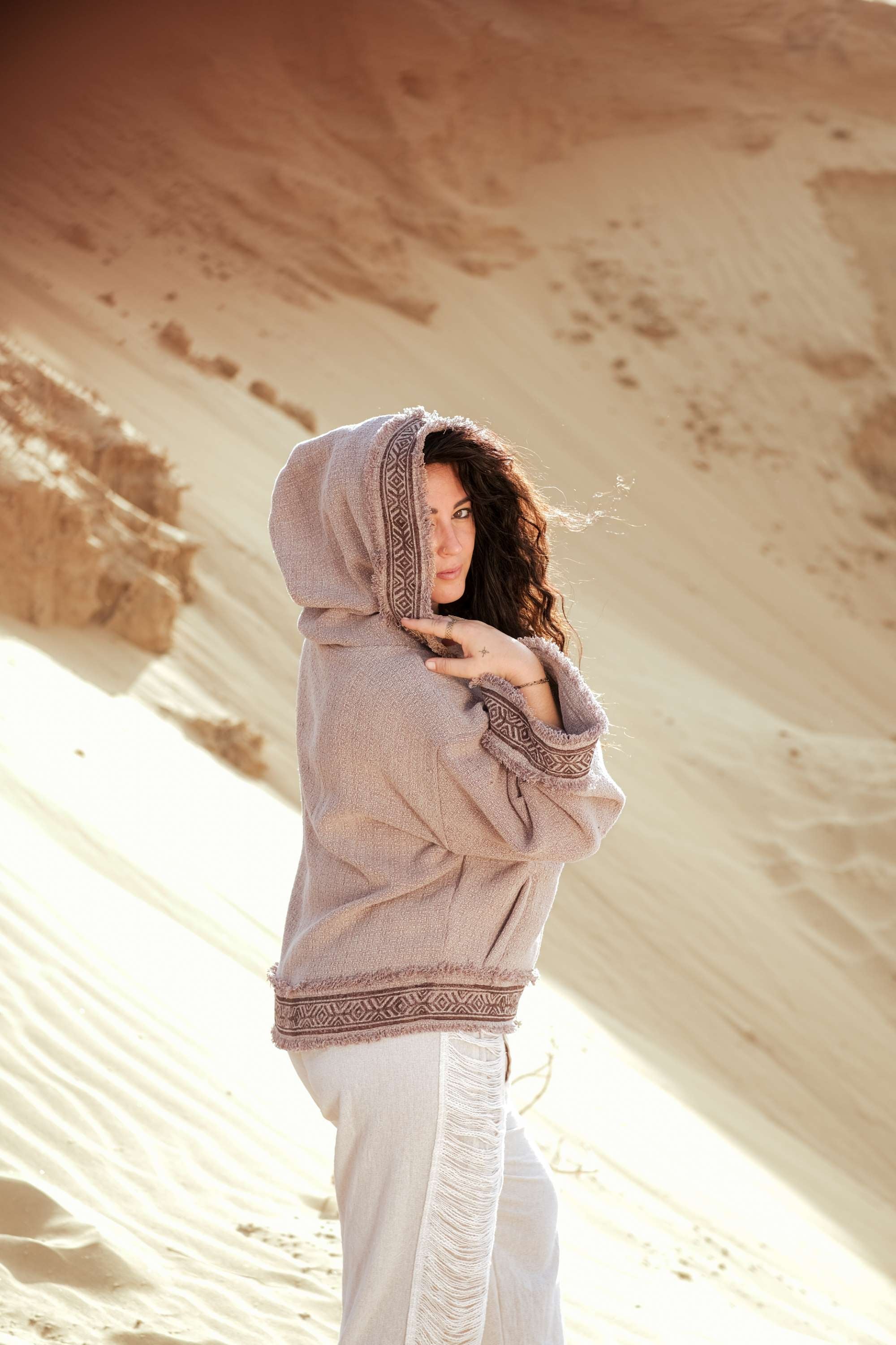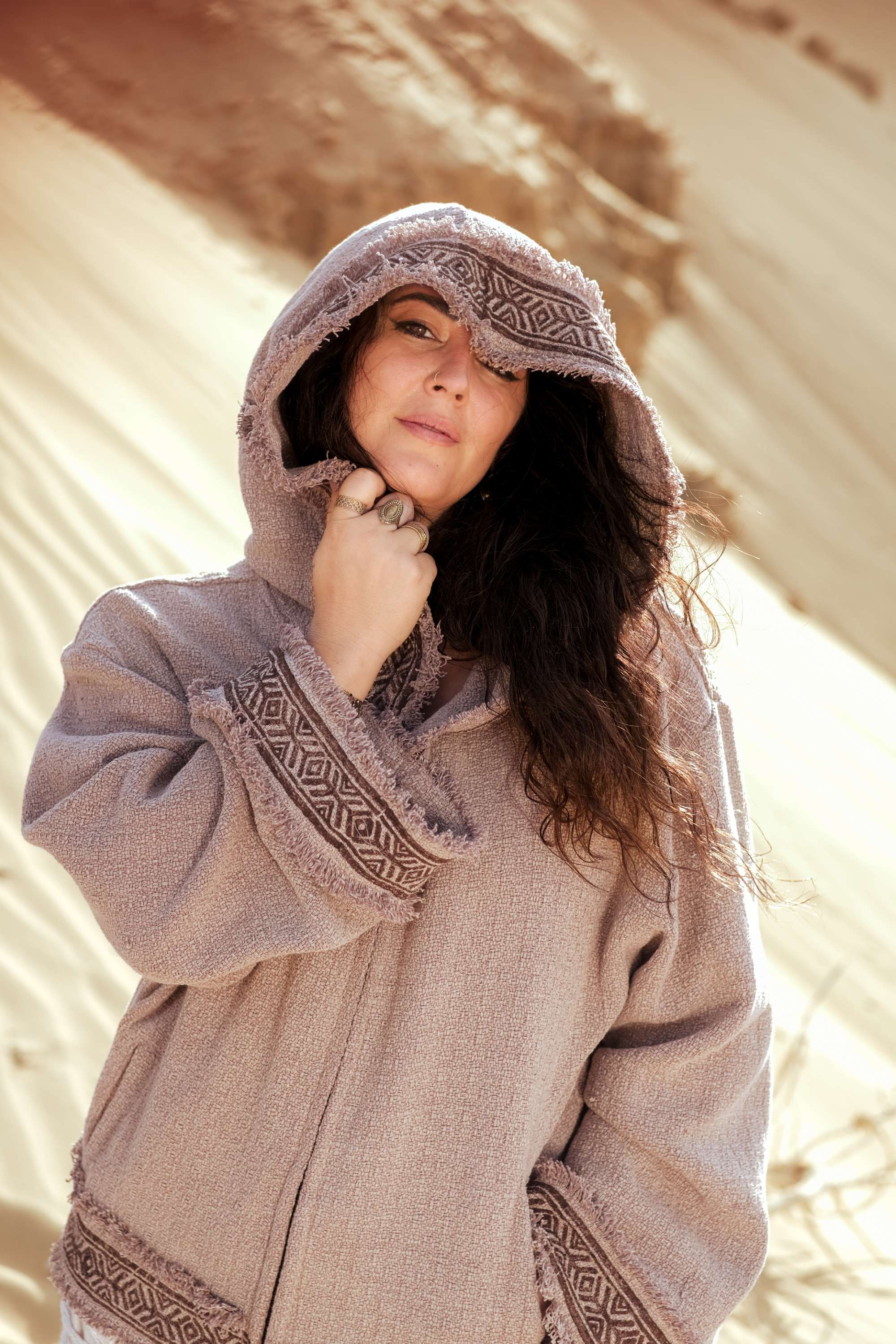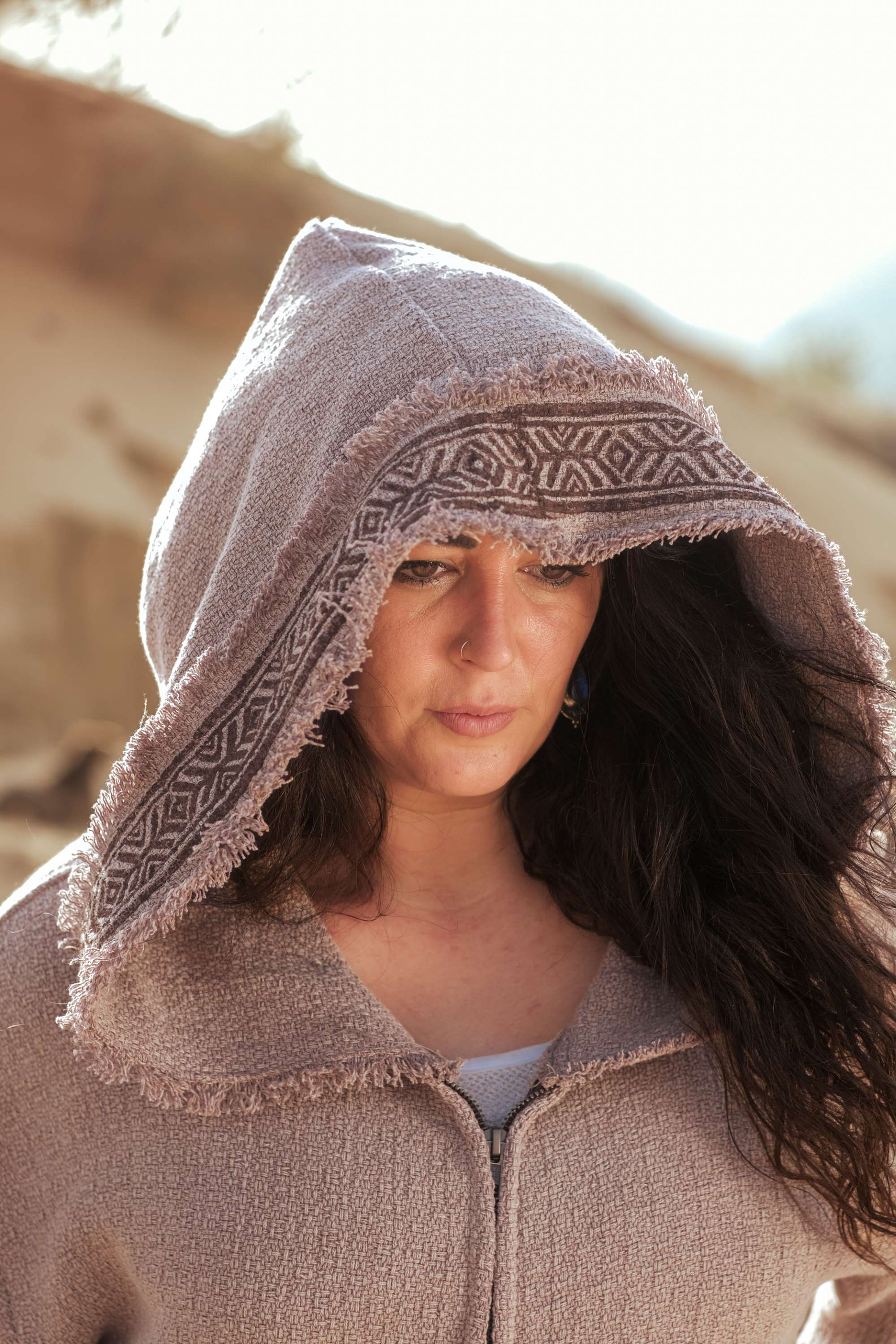 Its wide sleeves, oversized hood, and raw-edge detailing bring an effortless, free-spirited charm.. Block print details adorn the fabric like sacred markings, reflecting a deep connection to artistry and nature. Thoughtfully designed with deep pockets and a sturdy zipper closure, this jacket offers both practicality and statement-making beauty.