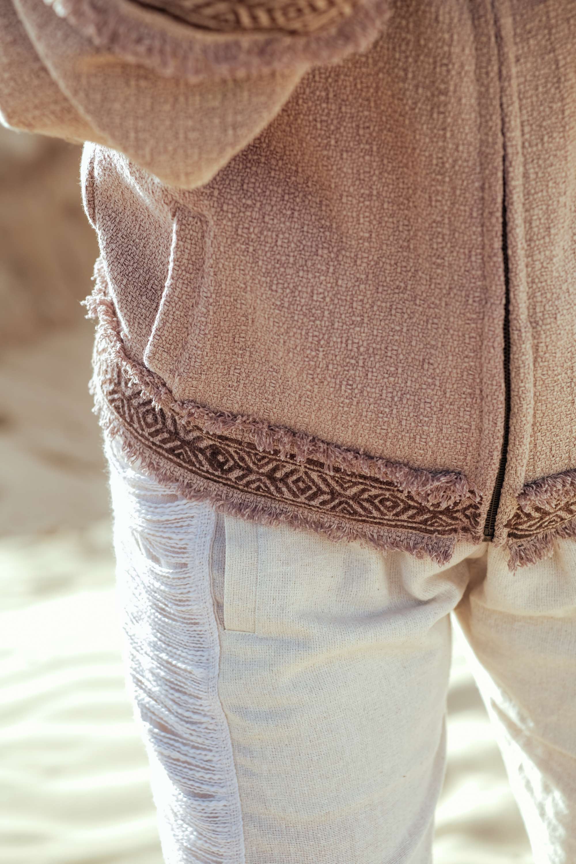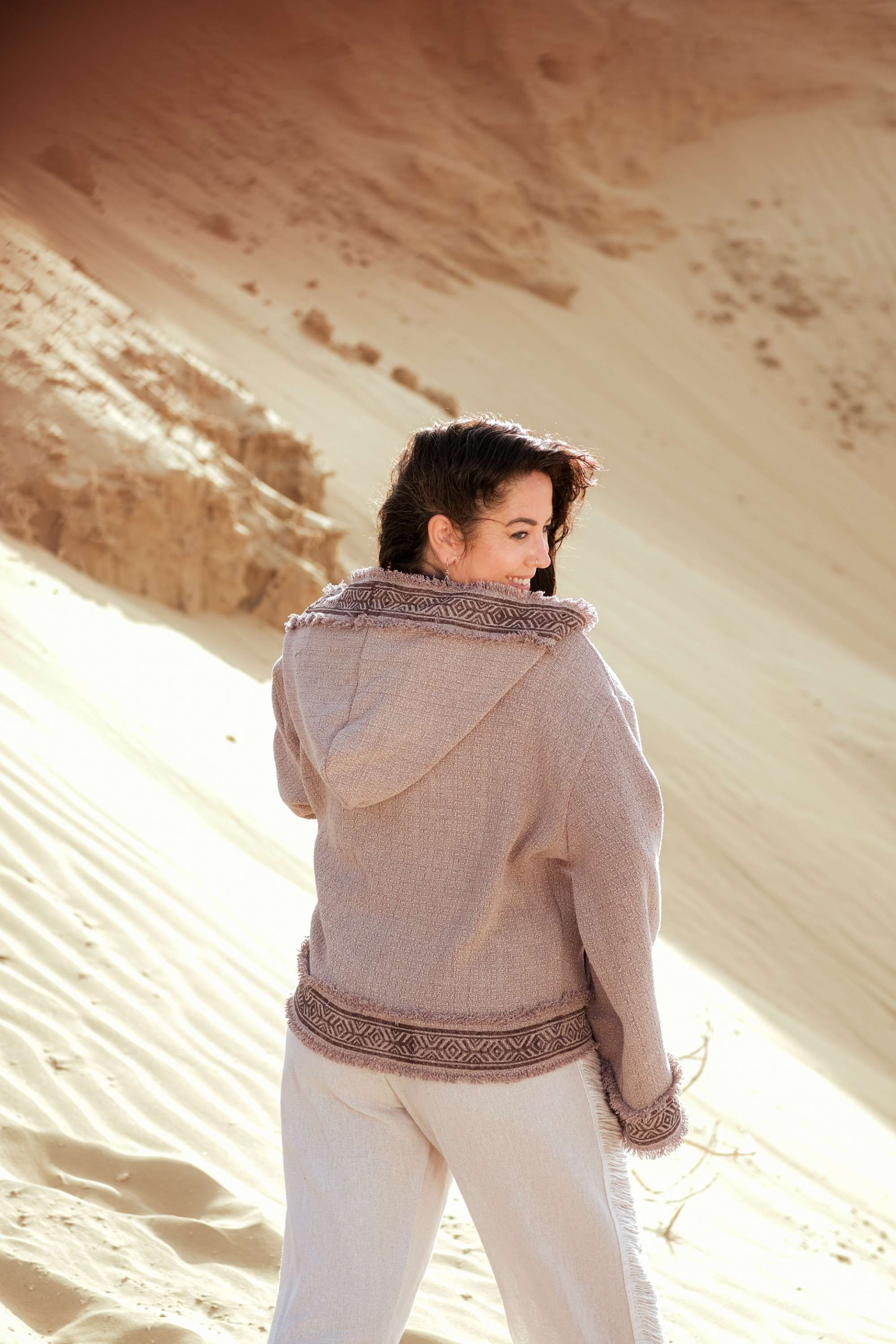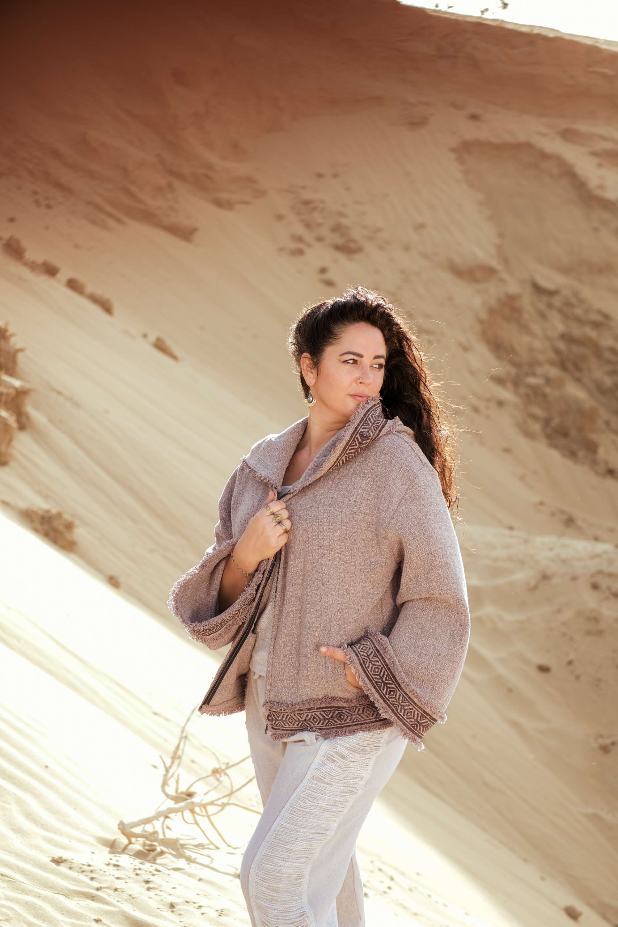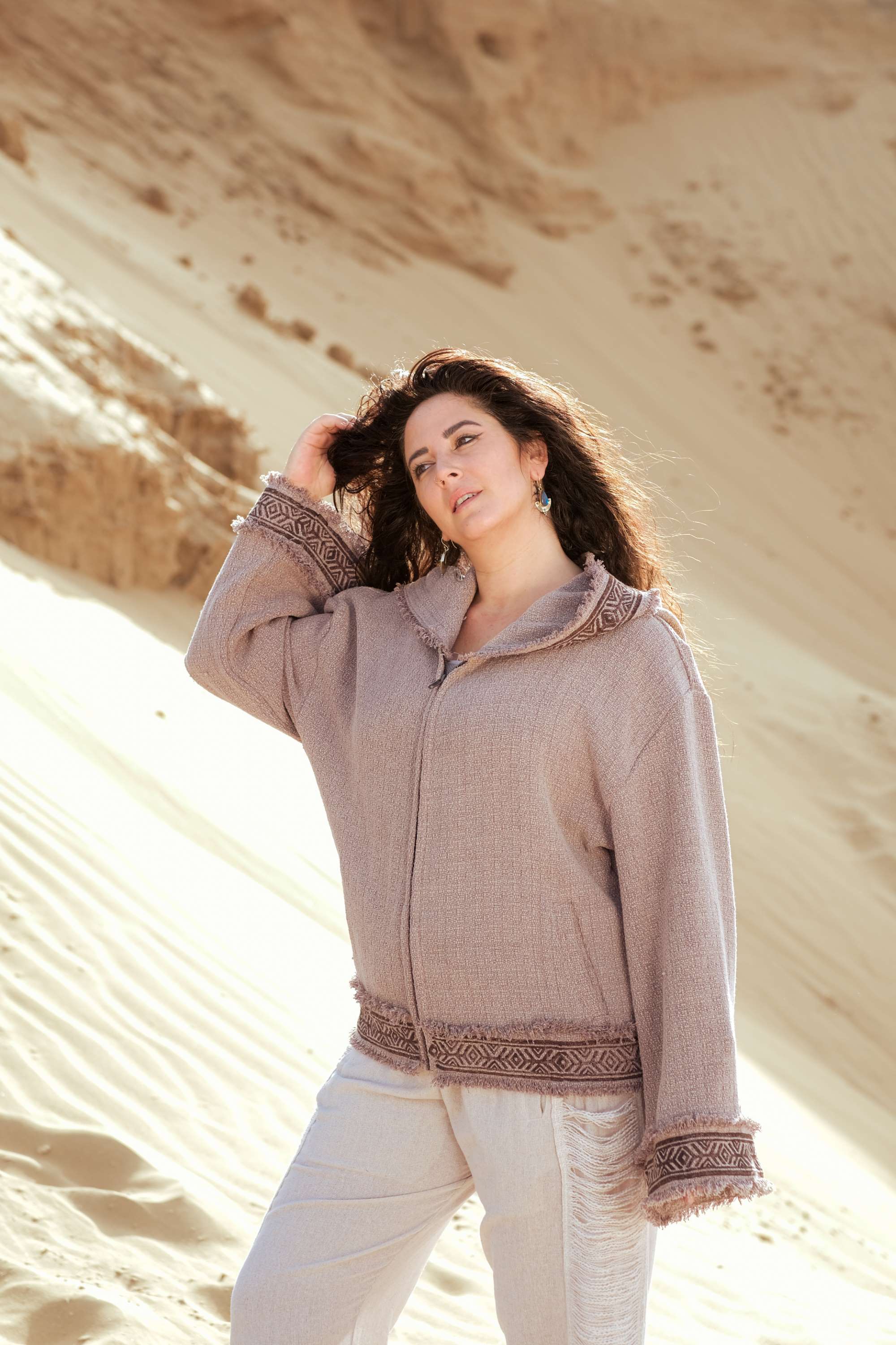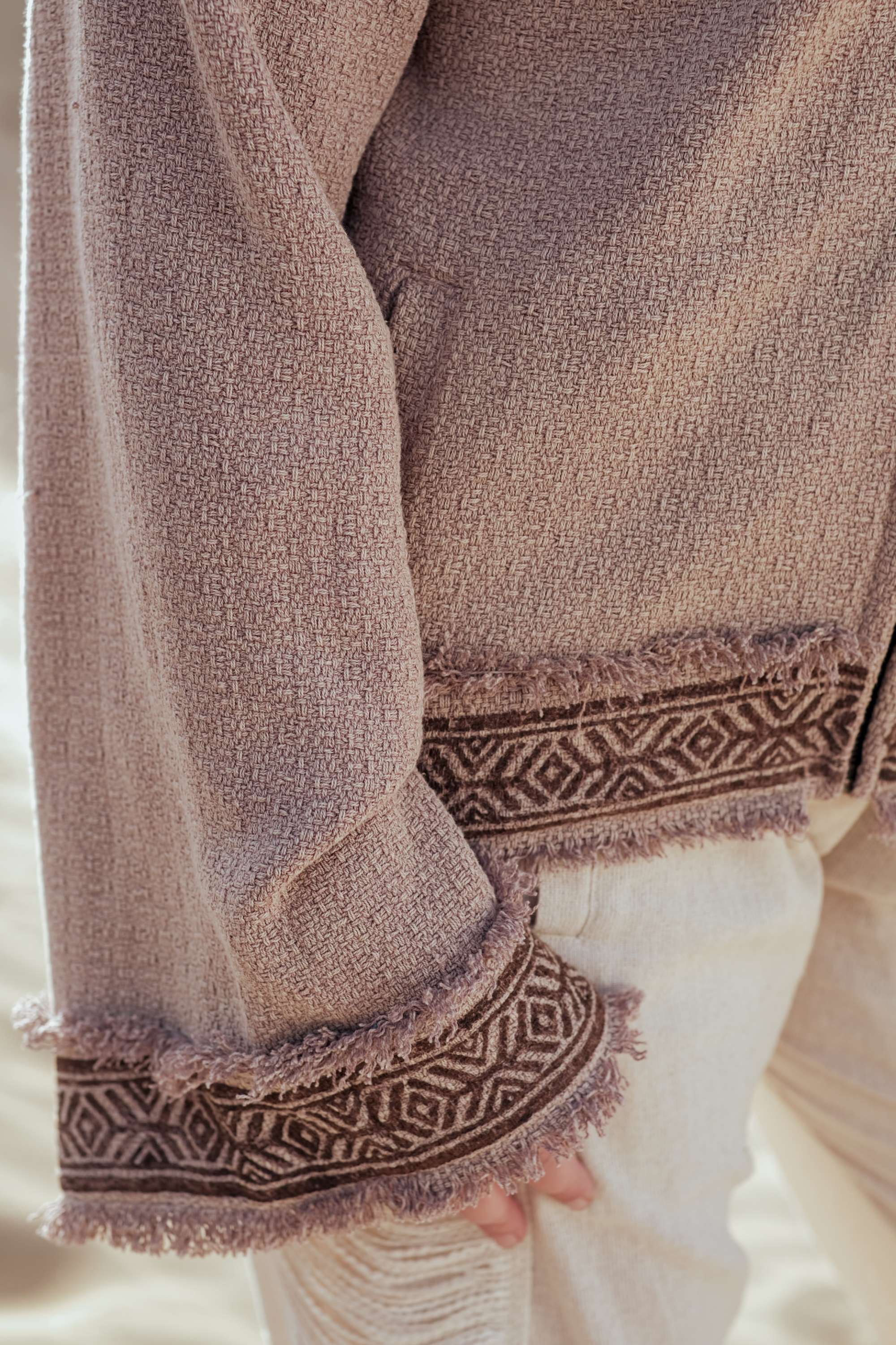 Its wide sleeves, oversized hood, and raw-edge detailing bring an effortless, free-spirited charm.. Block print details adorn the fabric like sacred markings, reflecting a deep connection to artistry and nature. Thoughtfully designed with deep pockets and a sturdy zipper closure, this jacket offers both practicality and statement-making beauty.