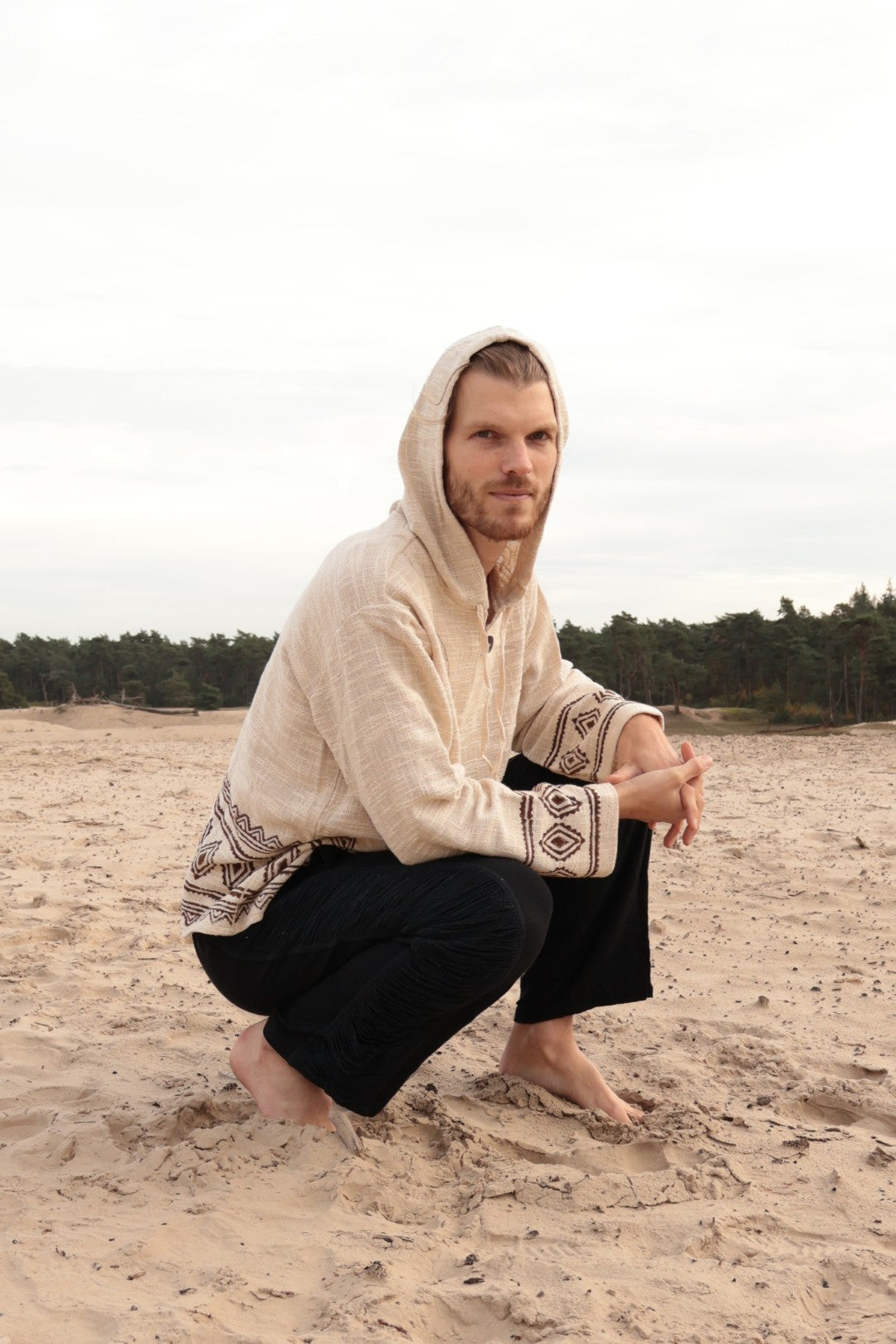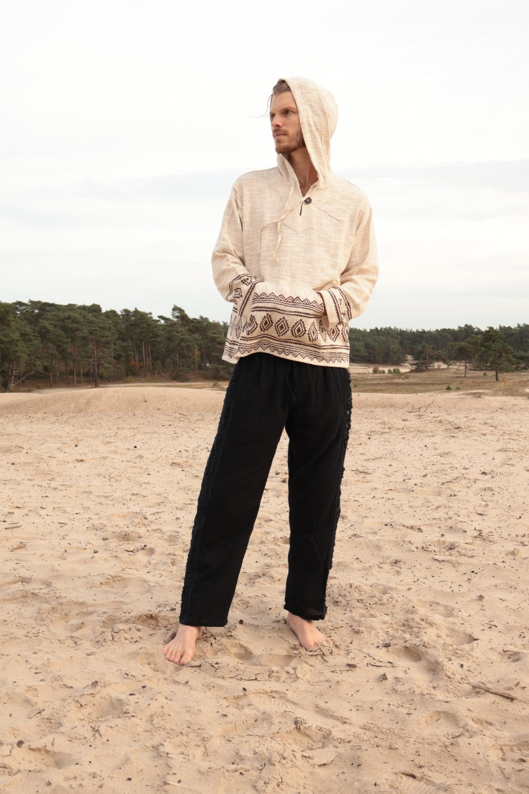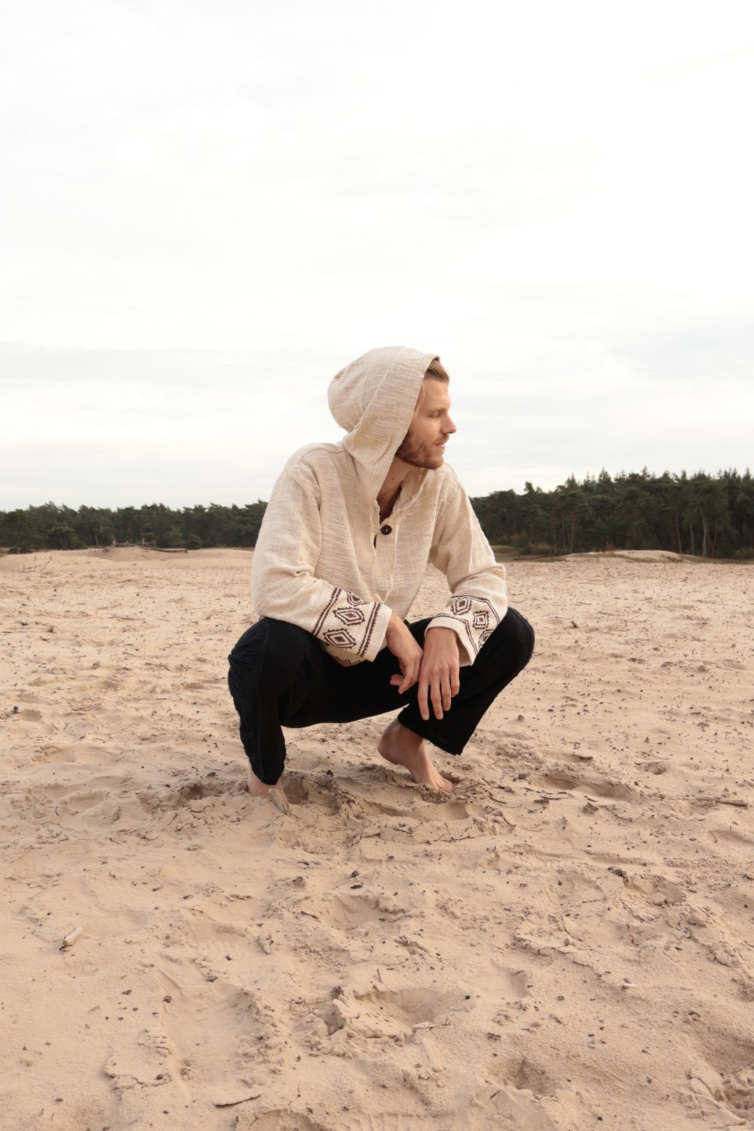 The Earth Dancer Pants are crafted for both ritual and everyday wear, blending comfort with ceremonial style. With a straight fit, these pants feature an open-weave strip of raw cotton along the sides, giving them a unique, earthy texture. The elastic waistband and drawstring allow for a perfect fit, while the natural look and feel of the fabric enhance their connection to the earth. Designed for movement and expression, these pants invite you to dance to your own rhythm.